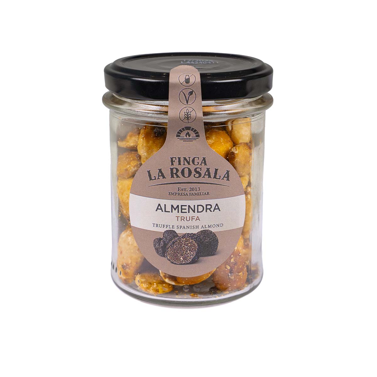 Almendra “Valencia” sin piel, su gran textura y sabor la hace la almendra más apreciada por los consumidores. Tostada a mano con una mixtura de azúcar de caña integral, trufa Aestivum y aroma de trufa