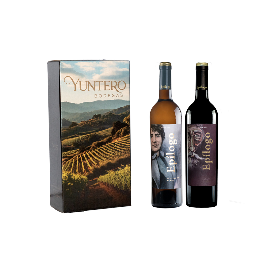 Estuche que contiene Epílogo Tinto y Epílogo Sauvignon Blanc